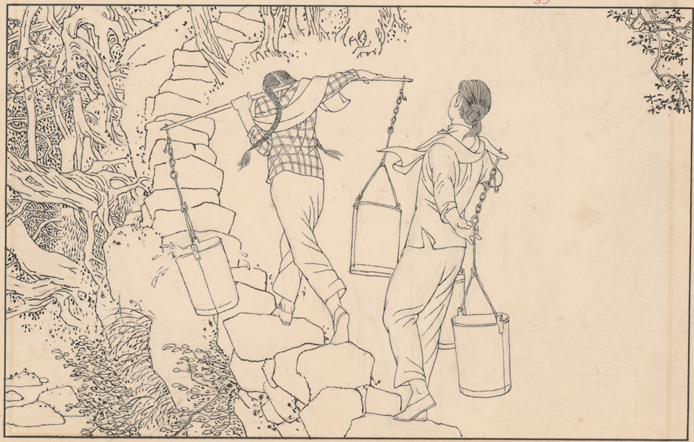 爹爹下乡体验生活与农民同吃,同住,同劳动。挑担,浇粪,样样干。每次下乡一去就是几个月。在接到《山乡巨变》任务时是1958年底,临近1959年春节,去的地方是湖南益阳的清溪乡。当时农村交通不发达,县城到乡下没有汽车。他们下乡是除了床架和尿壶不带,其他都要自备的。他只能在街边小店买了一根扁担,将行李挑着翻山越岭十里路走到乡里。一路上因为走热了,脱下衣服往扁担上挂,结果衣服越来越少,担子越来越重。第一次下乡带回来的稿子没有通过,到1959年中又第二次去益阳。彼时正是三年困难时期,食物紧张,为了减缓自己饥饿,他就吃几口压缩饼干猛喝水,然后躺床上不动,生活相当艰苦。当第二次下乡回来稿子又被否定后,他决定摒弃原来的画风,从传统绘画中汲取营养,再以人物塑造入手,最终作出了《山乡巨变》这部连环画领域里程碑式的作品,个中艰辛不是我现在描述这么轻松的。他在工作上对自己的要求是近乎苛刻的,对创作全身心投入,一丝不苟,从不敷衍。在他创作《山乡巨变》的时候,下班前他会将当天的画稿放在抽屉口上,第二天上班打开抽屉的第一眼,要是感觉画稿哪里刺眼,那里就是毛病,即刻修改或重画。即使在饭桌上,他也时常会出神,一个念头出来,就用筷子沾点酒,在桌面上划呀划的。平日里要么在写字台上画画,要么就是在房间里来来回回地踱着步子。
