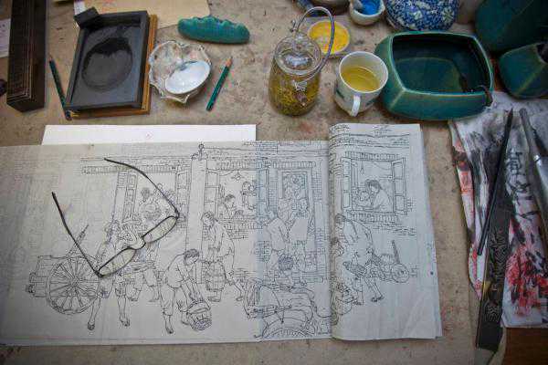 爹爹认为自己就是靠劳动吃饭的一介平民,付出和所得怎么样,皆以平常心对待,欣然接受。一直以来,他的生活起居条件和物质积累与他的艺术成就始终是一个反比的状态。爹爹的住房和创作条件的简陋被媒体介绍过以后,很多人想帮他改善都被他婉拒了。他认定只有付出才能得,他不会以自己的名气沽名钓誉去换那实惠的东西。北京的荣宝斋曾经想请他画一套中国人物画,价钱出得很高。当时爹爹刚恢复工作不久,除了工资根本没有额外收入,家里的经济情况并不好,但这事还是被他回绝了。他说他是个只会画连环画的人,别的他不会。他明白虽然那可以来一大笔钱,但是他更明白什么该坚持,什么该放弃。那些年社会上连环画这种形式几近淘汰,很多同道都转型画中国画了,可九十多的老父亲还是趴在他那不足十平方米的小房间里的画桌前,日日“精耕细作”,埋头画那“小东西”,如他的闲章“乐此不疲”。