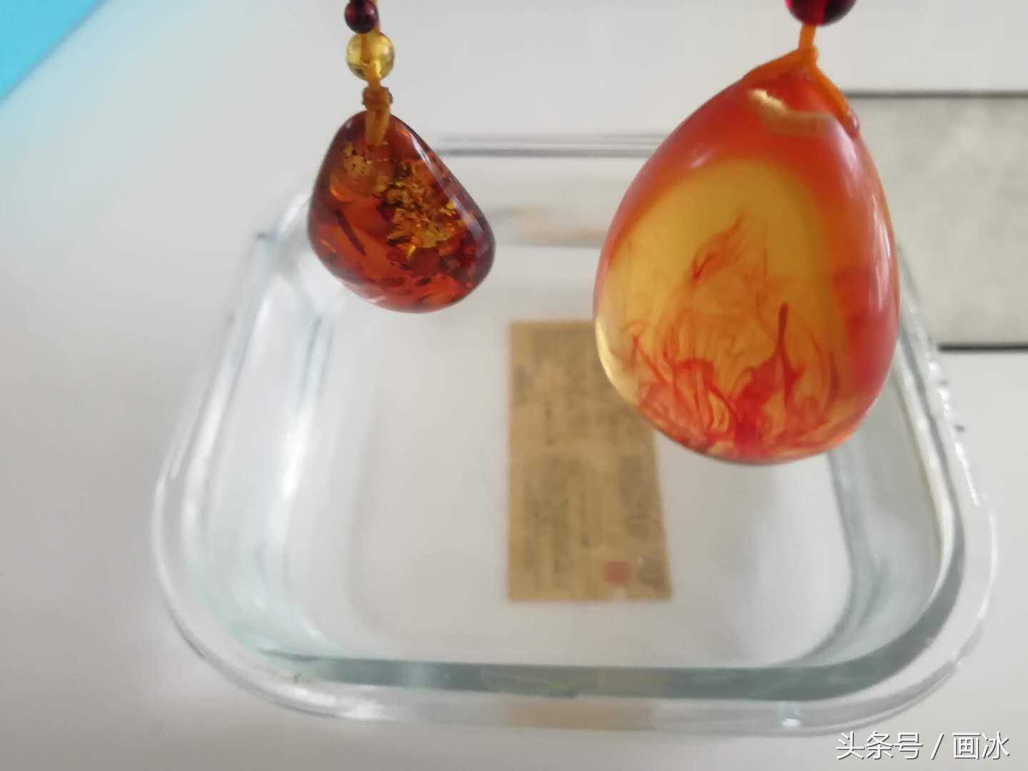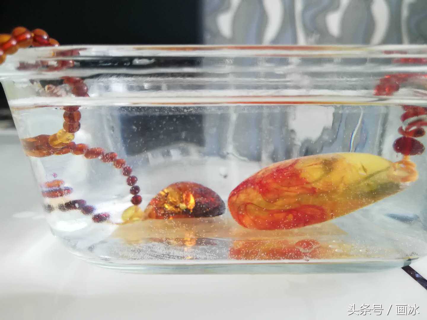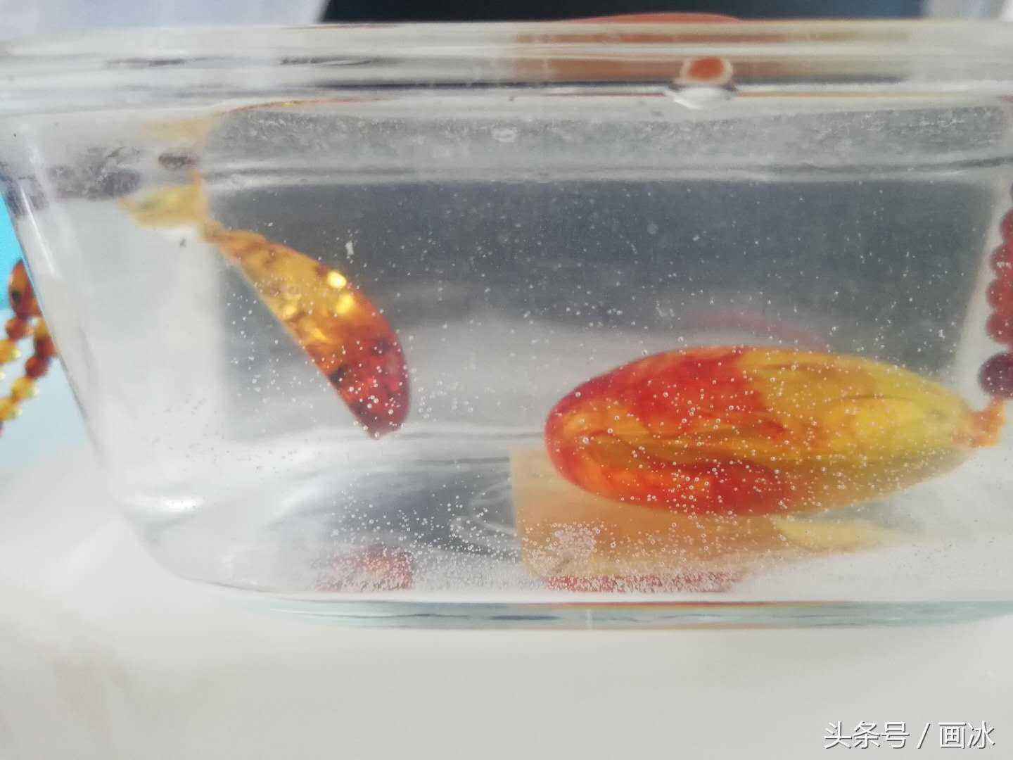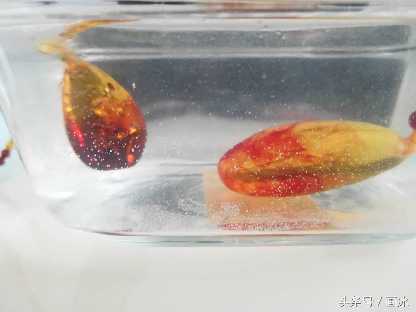 上当后,我开始认真学习琥珀鉴定方法,今天就分享一个最简单有效的方法——盐水(清水)综合鉴定法第一步:将琥珀放入清水中观察,如何飘起来的话肯定是假的。但是这两块都沉底了,看不出真假啊?别急,还有第二步。