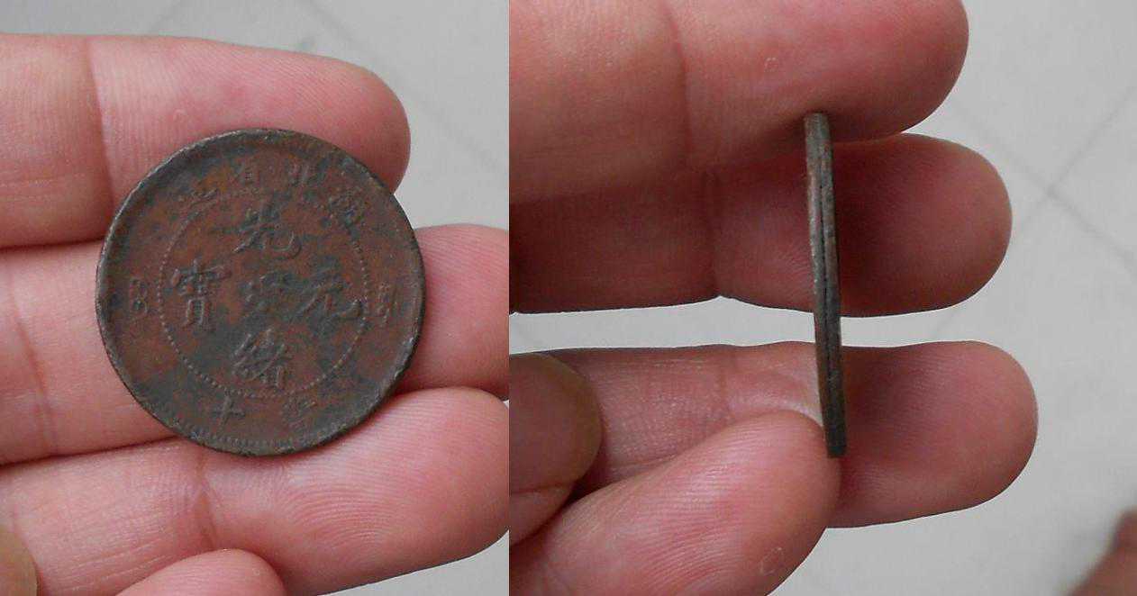 4.两片铜片拼接铜元。这是由于生产出来的铜材料太薄,或者是用剩下的边角料,也没有回炉,直接把它们重叠在一起到冲床上冲压成铜胚,然后又冲成铜元,这种情况也不多见,或者许多人没注意到这个,成品铜元不像其它铜元声音清脆,它声音哑,在边缘处仔细看能看到两片铜片拼接的痕迹,但大多在冲压后已经不明显了,我曾经收到过几枚,留了一枚湖北光绪十文边缘接缝处最清晰的。这种铜元品相明显没有正版好。