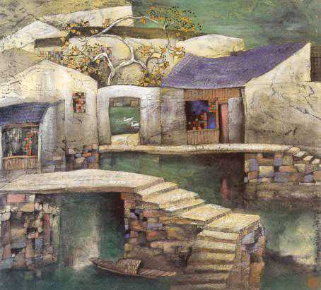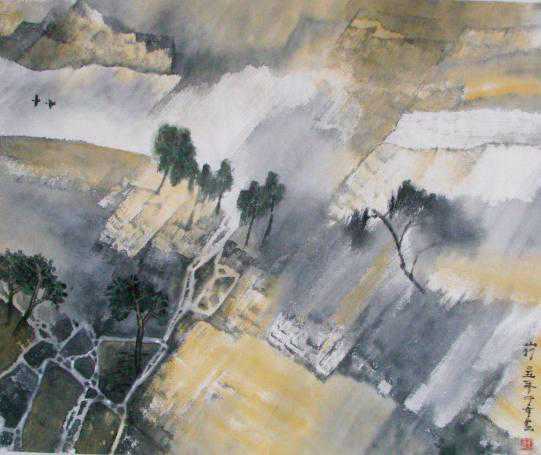 几何状结构,具有鲜明的装饰性特点,其西画的抽象格调,一向被划归“现代派”的行列。因文化意识的不同,西画的抽象与中国传统山水画的抽象也就有着本质上的区别。中国传统山水画的抽象是把山川草木等自然元素符号化,而现代派绘画的几何状抽象则是摆脱了对客观实物影像的纯粹模仿,而将客观景物提炼成一种观念和潜意识的意向表达。