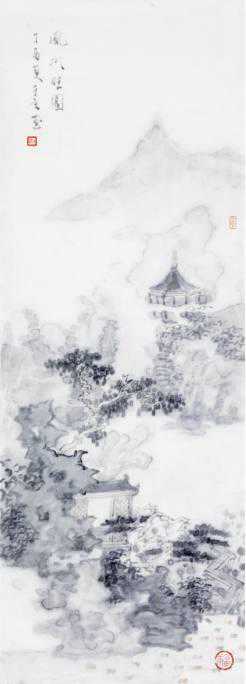 如《雾染园林》的手法表现。通篇色调柔和,墨迹较浅。大量的用水使得画面犹如水中之画,时明时暗,若隐若现。每个细节处,均依稀可见墨色与水的身影,不即不离,相行相伴。其间小桥流水,庭院回廊,百转千回,曲径通幽,透出生机无限。画中远处的亭台楼阁,因为窗户的展现,使其封闭中蕴藉通透,迷茫中含蓄辽远。画的最右侧,一片微白的雾气将景物遮掩,不仅使整幅作品的着色有了阴阳渐变的层次感和雾的神秘感,而且画意纠葛中略带缠绵,给人以言有尽而意无穷的关联,犹如身临“太虚幻境”,充满奇想。