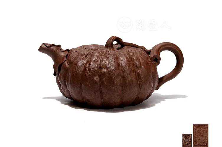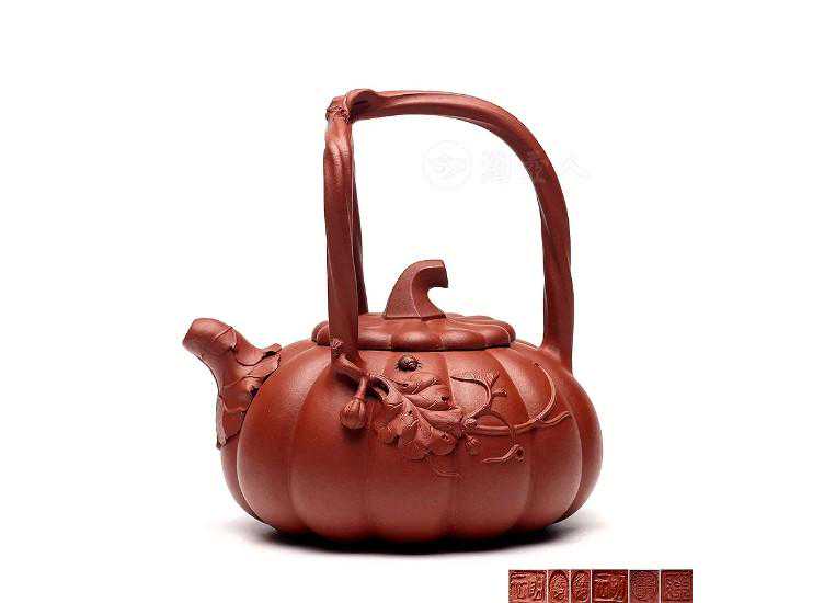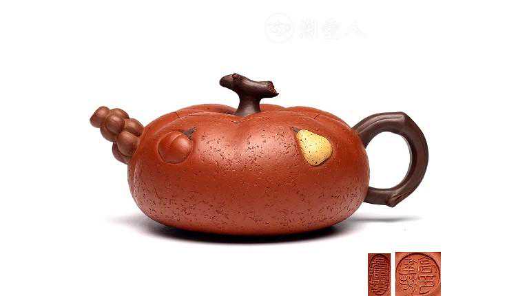 壶体如瓜体,饱满的壶体等比分割为12瓣南瓜形,壶盖同为12瓣南瓜盖,六边形南瓜钮弯折自如。瓜藤弯折、交叉,挺起三杈提梁,于提梁起始处贴塑嫩生生的瓜叶、瓜蔓与生动形象的小瓢虫,深厚之功力,充沛之气韵,无需赘言!