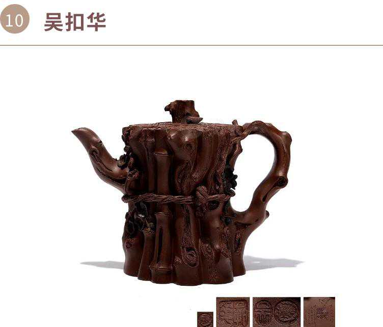 省名人吴扣华师承徐秀棠、邵新和、吴汝莲等名师,制壶、雕塑、陶刻、书画皆有涉猎,技艺相当全面。其在紫砂创作中主攻花器茗壶,讲究作品的形神兼备、新颖别致,在实践中创新了全手工“贴梅花法”、“塑竹根法”等新工艺。