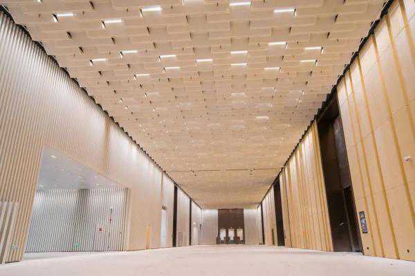在会展中心会议楼的公共走廊及U形廊,天花板以双曲面铝板错拼出西安兵马俑铠甲肌理,通过造型变化出丰富的空间层次。