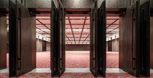 以青铜礼器纹理精雕的古铜门则提炼自大雁塔轮廓线条,并重新组合成折面的暖灰色墙布硬包,烘托庄重氛围的同时,还能增强吸音效果。