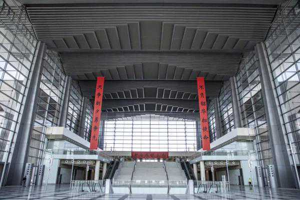 会展中心展览馆登录大厅气势恢弘,形成展览各馆的制高点。展厅底座设计为石材立面,隐喻西安古城墙的形式语言;展厅大门采用高耸的金属门框,以现代设计再现城门这一主题。