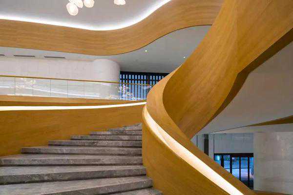 走进剧院,一个巨大的盘旋楼梯,如同壁画中的霓裳羽衣,两袖舒展,迎面而来,形成剧院空间的铺陈和引导。设计打破了矩形门厅空间沉闷、刻板的格局,将唐代乐舞的意象融入室内建构,在灵动、轻盈的流线中迂回辗转,凸显出空间的艺术性和戏剧性。