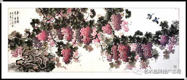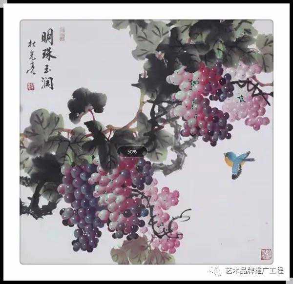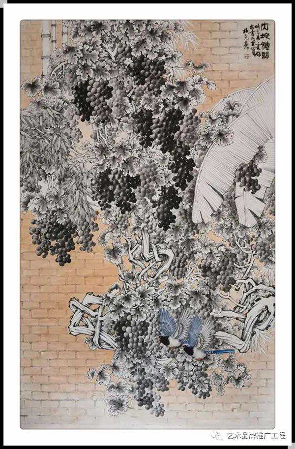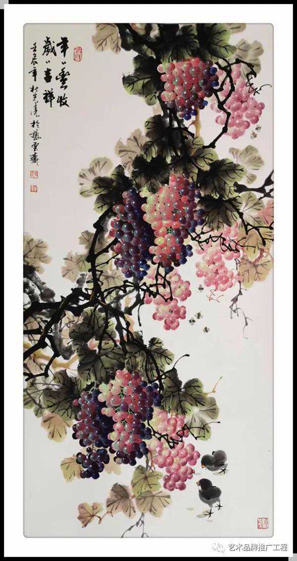 中国艺术向来追求读万卷书,行万里路,读书是对间接经验的吸取,而行路正是体验感受再沉淀的过程,杜先亮老师在自身的艺术体系中寻求更完美,更适合自身个性的笔墨语言,未有不学而能得其微妙者,未有不遵古法而自能超越名贤者,长期的探索,让杜先亮老师深知,艺术没有捷径,唯有脚踏实地的钻研才会求有所获,艺有所得,杜先亮老师长于花鸟,多见于牡丹,但亦擅长于葡萄,在他的笔下,勾勒出的葡萄盛世图让人大有盛世欢歌的愉悦,一幅幅果实累累的图片,让人看到的是春华秋实的陶醉,是艺术,但更是收获,所以说,欣赏杜先亮老师的作品,给人带来视觉想享受的同时,更多是一种最朴实的生活情感,这也是杜先亮老师在追求艺术的道路上带来的人生境界的综合体验。