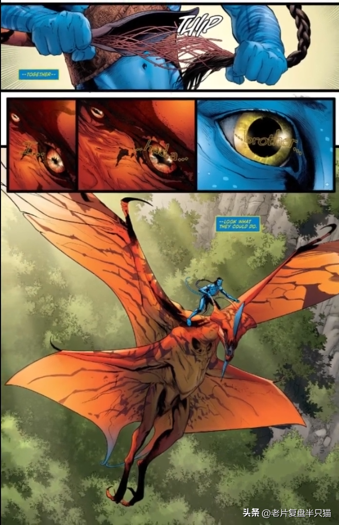 他骑上潘多拉星球最危险的飞禽猛兽——最后的阴影,在纳威人中建立起威信,并集结15个纳威人部族共同对抗天空人的部队。电影中,驯服的镜头只是惊鸿一瞥,而在漫画《阿凡达兄弟》中可以看到更多的细节。