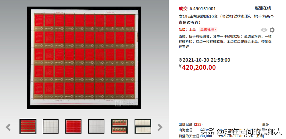 同样在邮票行情风向标赵涌在线上,这套文1新10套以42.02万高价成交。