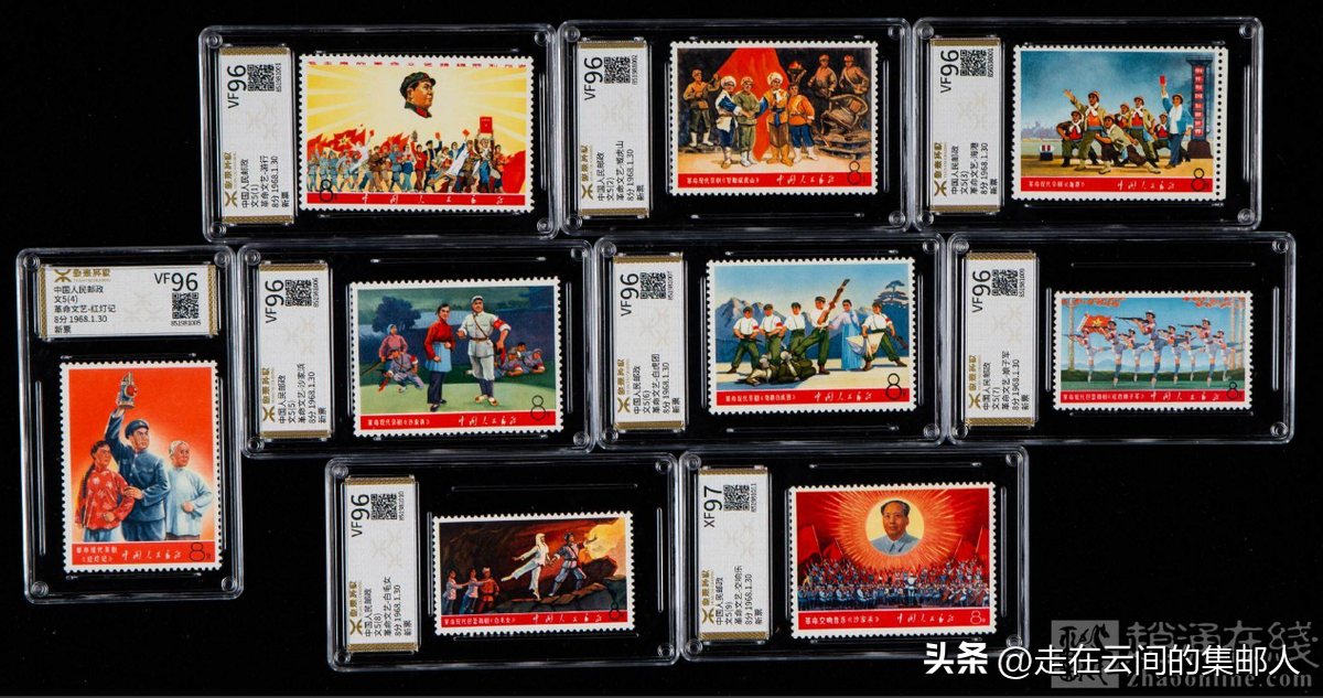 邮票选取《红灯记》、《沙家浜》、《智取威虎山》、《白毛女》等经典的文艺作品。文5全套全品品相的新票市场价格能达到2万元,经过评级认证的好品相邮票价值更高,比如这套经源泰评级金标认证的文5邮票,-9交响乐达到源泰XF97分(冠军分),其他源泰VF96分(亚军分),在赵涌在线上成交价格达到3.3万元。