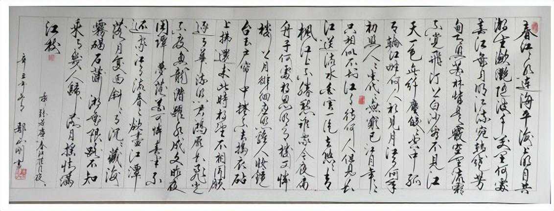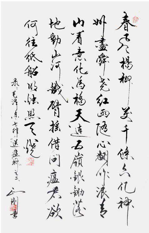 读鄢正刚先生的作品,你会发现他所取法的碑体,在字的结体上都是倾向于典雅、精美的一类!努力追求以“二王”为法,以米芾为“势”,以“欧柳”为骨,博采众长,突出个性;而不是那种表现碑意古拙苍茫意趣的。从表现上看;他的这种取法更贴近于帖的意韵,但帖的楷法结字和用笔规范往往容易流于甜熟圆滑,僵化干枯缺少情趣,所以他往往用欹侧、生涩的碑的结体趣味冲击平稳方正的结字法,表现出的是整体作品既不缺失技巧而又不失情趣,绝无生硬刻板之态。笔力沉厚是很多书家追求的一个方式,鄢正刚先生因为对于自我的创作有定位,所以在他的书法表现上,追求的不是笔沉力厚,而是一种爽利与劲健。这种笔法,就是在楷书用笔中融合行书的笔意,而使笔法丰富,这与他曾师法传统有着密切的关系,他的融入楷法中的行书用笔是一种纯粹的帖的用笔方式。简而言之,是其端庄人格中寓于深刻的艺术理念,从而写出奇绝精妙的艺术语言。他的字像海一样平静中蕴含着波澜壮阔,有庄严之峻拔又有险绝与跌宕,有自然平和又有生动空灵。他在用哲学驾驭书法的自然,表现出成熟的把握能力与审美素养。