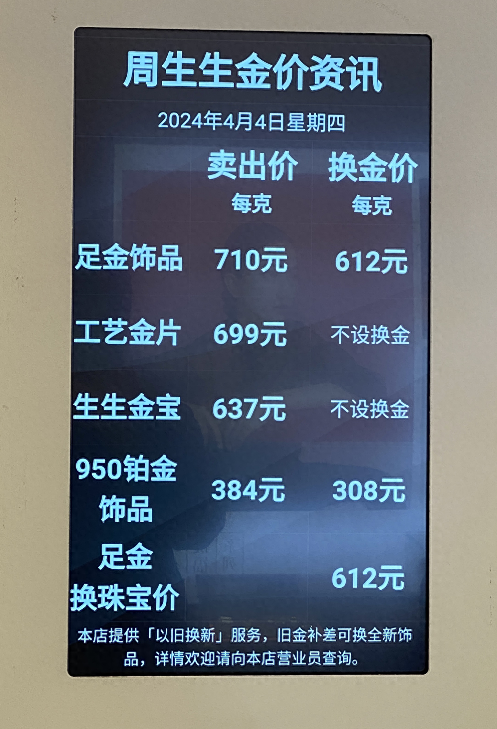 据她介绍,4月3日该店足金饰品每克报704元,4月4日上涨6元至710元/克。“不过,针对假期我们推出了黄金每克减30元的活动,活动后为680元/克,此外,部分首饰还有免手工费的活动,还是比较划算的。”