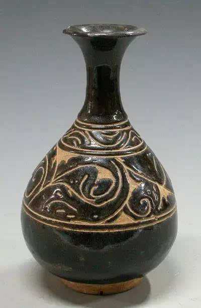 例3:黑釉剔花小口坛,金代,于1955年出土于山西省天镇县夏家沟村。此坛小口短颈、鼓腹圈足造型,釉色乌黑发亮,剔刻技术纯熟,线条简练粗犷,具有浓厚地方风格,是大同窑黑釉中的精品。