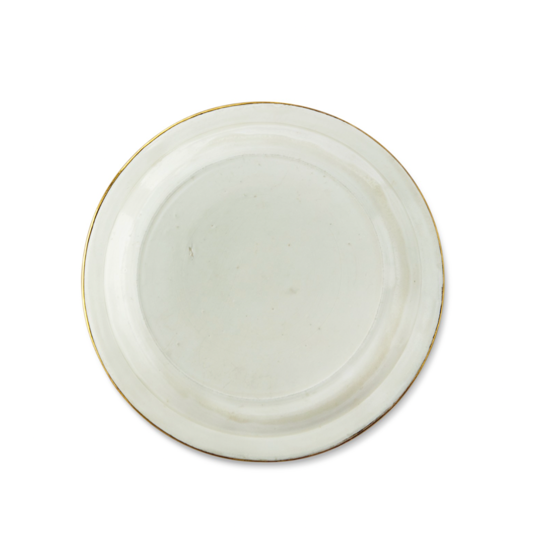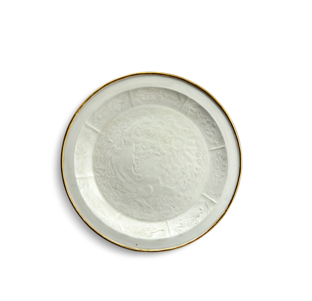 北宋/金定窑白釉印花佛狮戏绣球纹盘