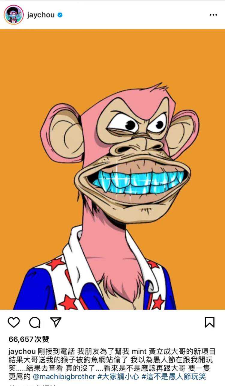 4月1日,周杰伦在INS上发文,称接到了朋友紧急打来的电话,说黄立成之前送给自己的“猴子”NFT被钓鱼网站盗窃了。一开始,他还以为是愚人节玩笑,直到本人亲自查看后,才发现是真没了。