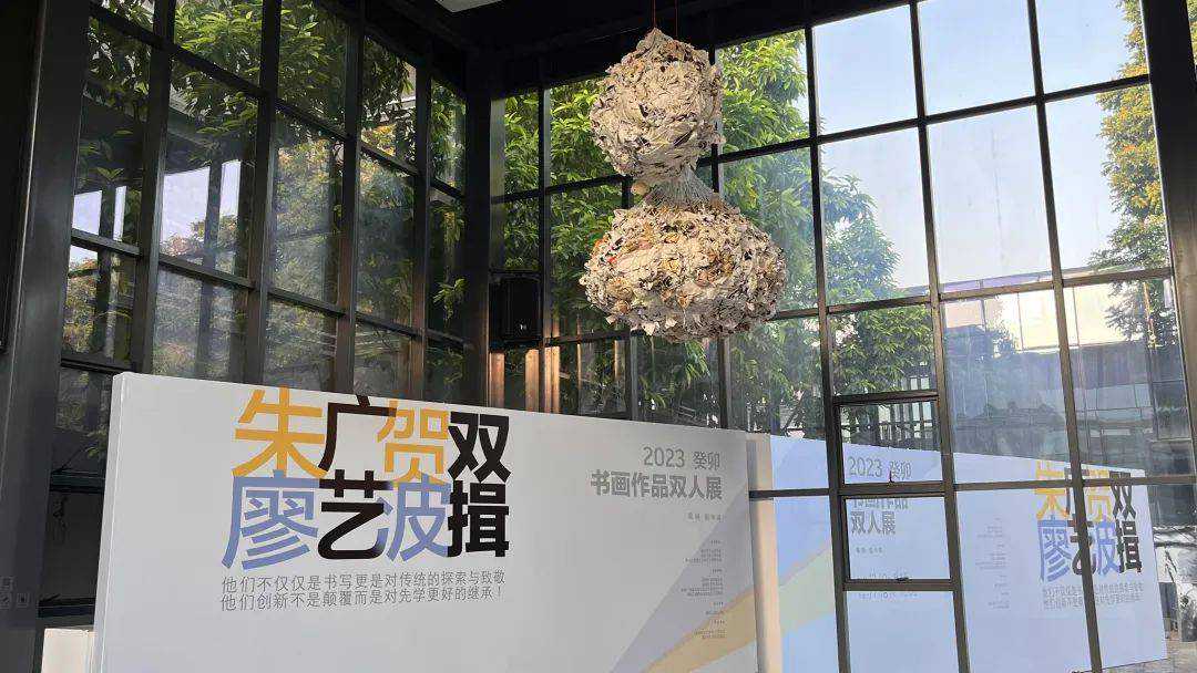展览现场用书法家平时创作的废纸作为展览的主题装置,高高的悬挂在展览现场。这样也就把观众引入到策展者想要表达的意图,即一个书法家的创新与探索不只是口号,而是通过日复一日的练习,没有废纸三千的积累,不会有真正的成果。这次装置即是宣扬成果也在传递一个信息:一个文化工作者的破境或重拾没有捷径。