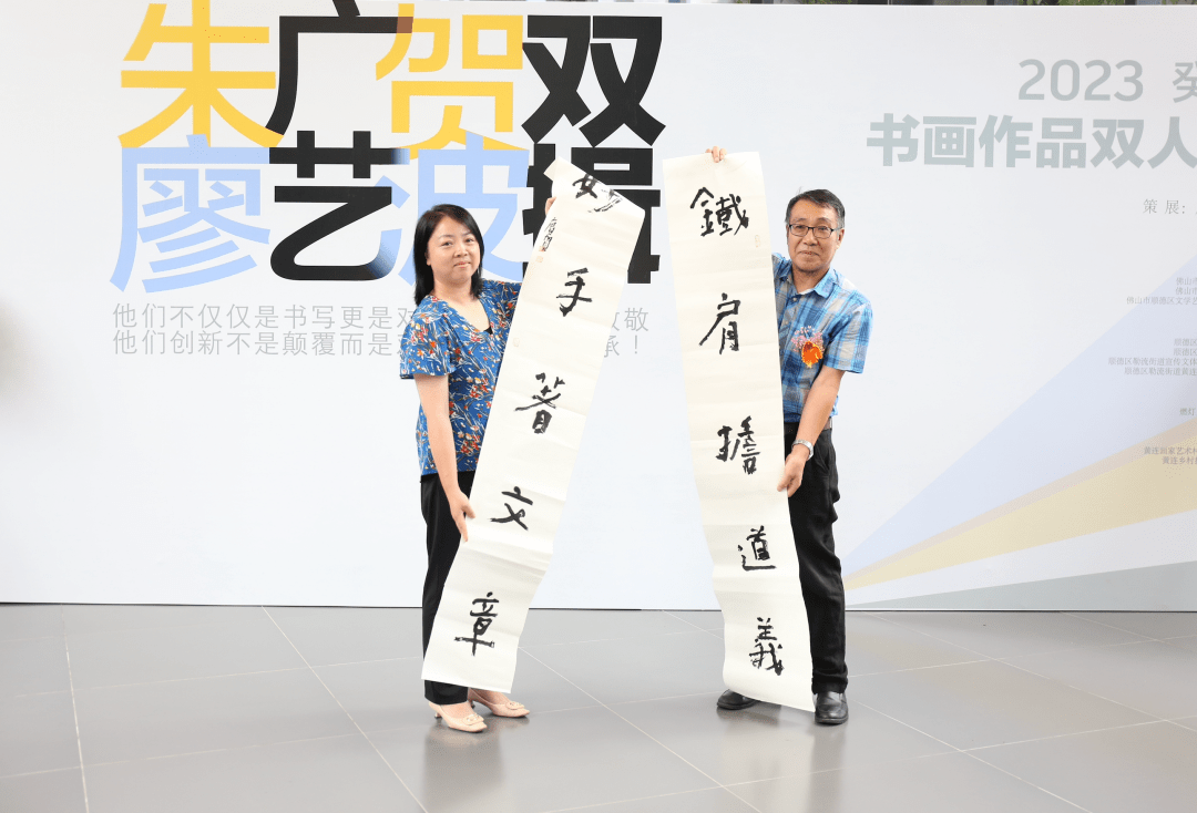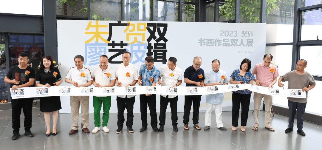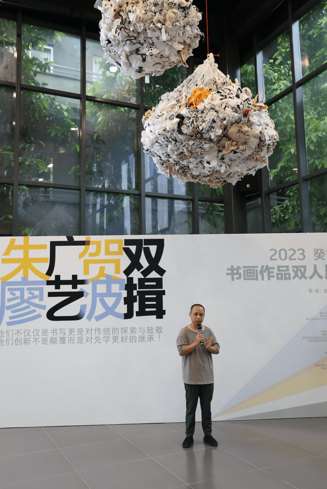 彭建生代表顺德书协对展览的举行表示热烈祝贺,他表示很荣幸参加朱广贺、廖艺波书画作品联展,非常开心与各位嘉宾艺友相聚顺德黄连,一起来见证两位老师的展览盛况。他代表顺德区书法家协会对朱广贺廖艺波两位艺友的联展表示祝贺,他说:在迎接展览开幕之前,我已经认真看了展览的链接,而刚才我也认真浏览了现场原作,可以说很震撼,很精彩!看到了两位老师的精神追求与艺术探索成果,我感觉两位老师的书写风格很搭,不违和,这应该算是双人展的成功案例,值得借鉴和推广。朱广贺老师生活、从艺在佛山,书画印早已被同行所称道,今天展览的作品确实值得一看再看,细品慢品。而艺波兄是我熟悉的朋友,他喜欢写大草,每每酒后催发能量,激发性情,铺纸引墨,挥写胸中之快,如此,真性情的艺术实践,有多少人懂我不知,但我懂,他展示的许多作品都很精彩,品读起来很享受,当然估计有更多的习作成了废品,如现场我们头顶上的装置,所以朱广贺廖艺波两位都是探索型的艺术家,作为从艺者,我们应该为他们的探索实践精神而鼓掌,当然,祝贺两位老师展览成功,艺术水平猛进。