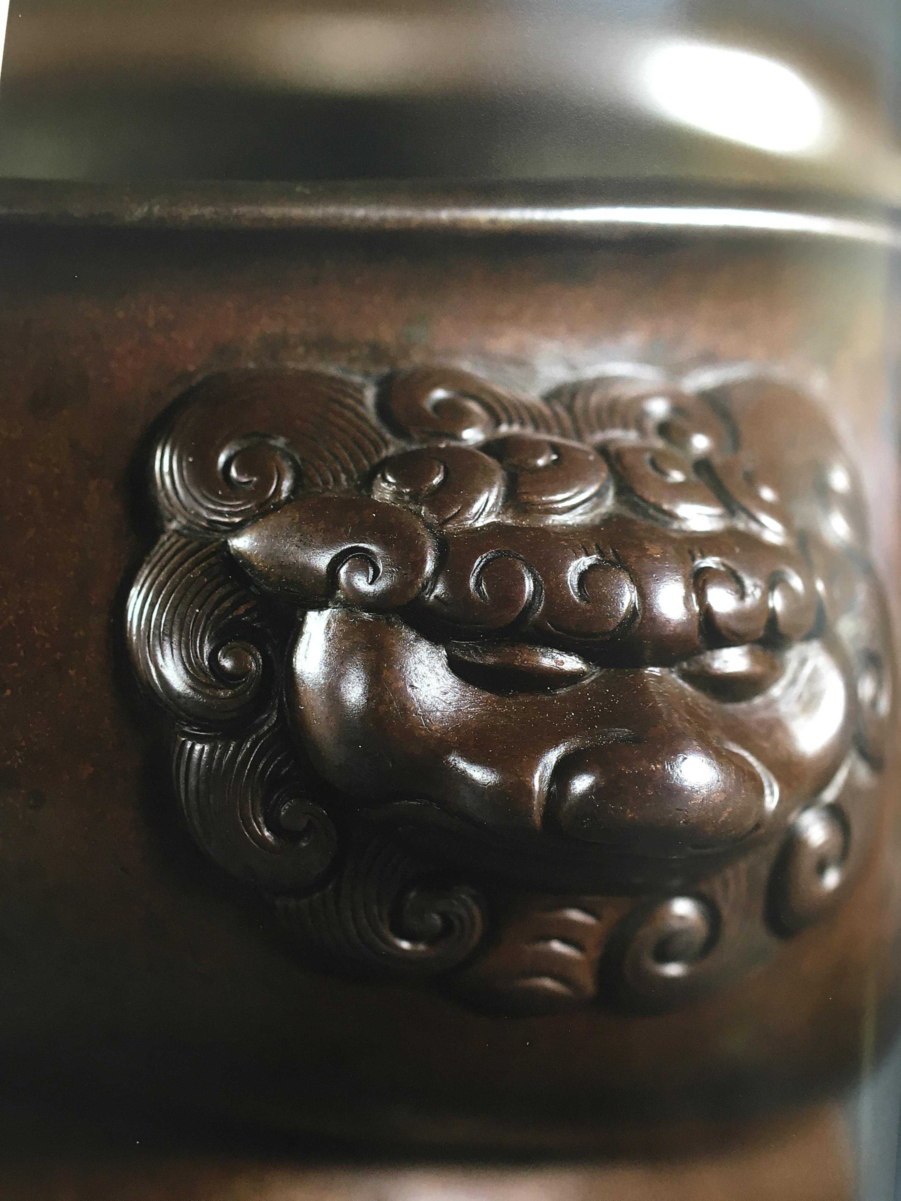 炉身形状与蚰蜒耳炉相似,炉耳塑狮首而得名,《宣德鼎彝谱》中有载,狮耳炉为宣德年间御赐兵部尚书及大都督等军职人员之器型,取其威猛之意。有文殊菩萨坐骑,故狮头炉适宜供养。那么这段文字也基本就说明了他的使用用途和位置,时至今日很多爱好此道的朋友孔武有力者,问笔者应选何种宣德彝炉笔者依旧推荐此款,同其他宣德炉耳一样,狮耳炉也有造型上的变化,可用于参考判别年代。