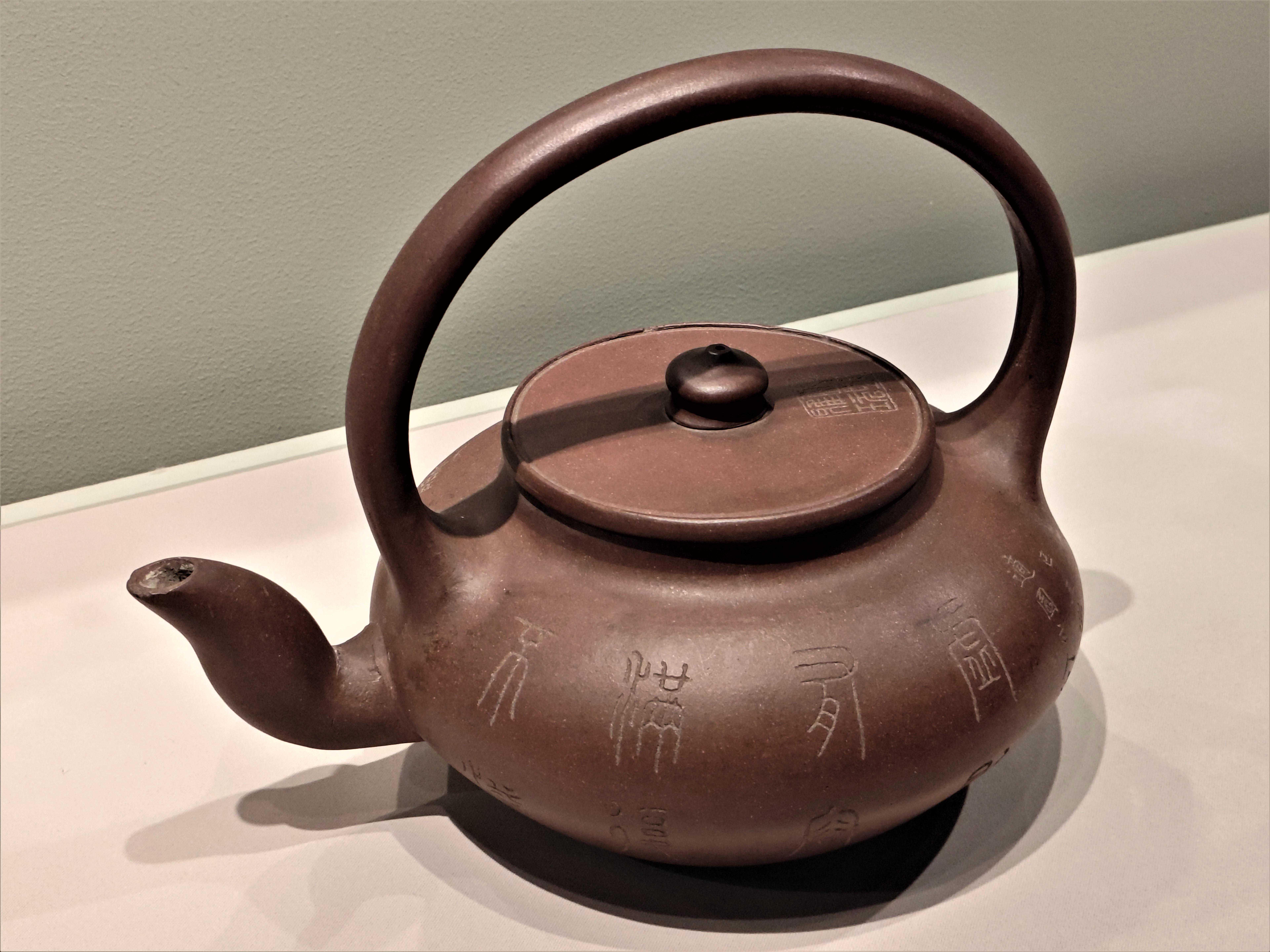 这件出土于江苏南京明代私立太监吴经墓的紫砂提梁壶,制作年代不晚于嘉靖12年(1533年),是目前所见年代可考器物中时代最早的紫砂壶。其弧形与同一时期画家王问所绘《煮茶图》上的提梁弧造型一致,互为对照。