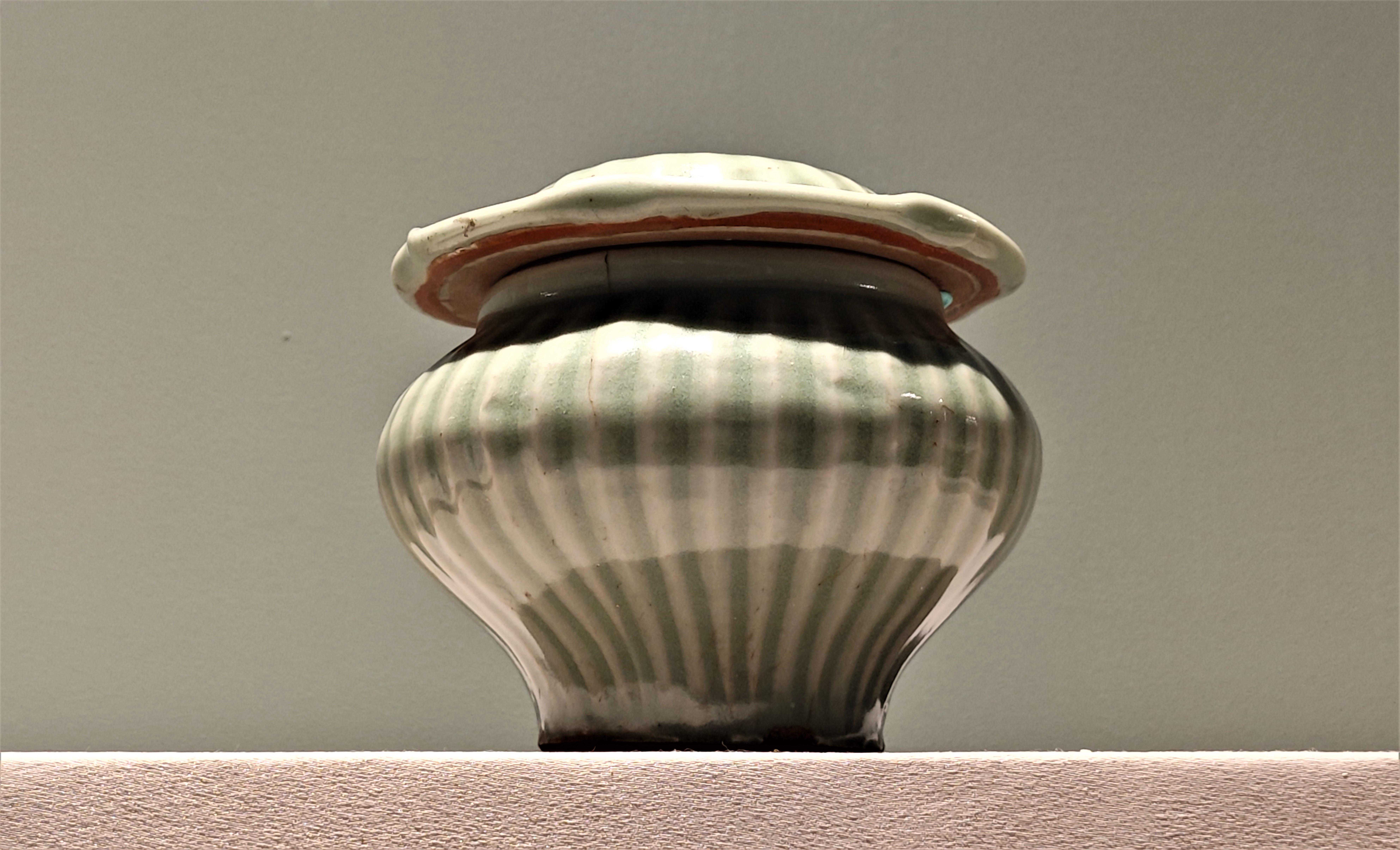 龙泉窑青釉条纹荷叶盖罐