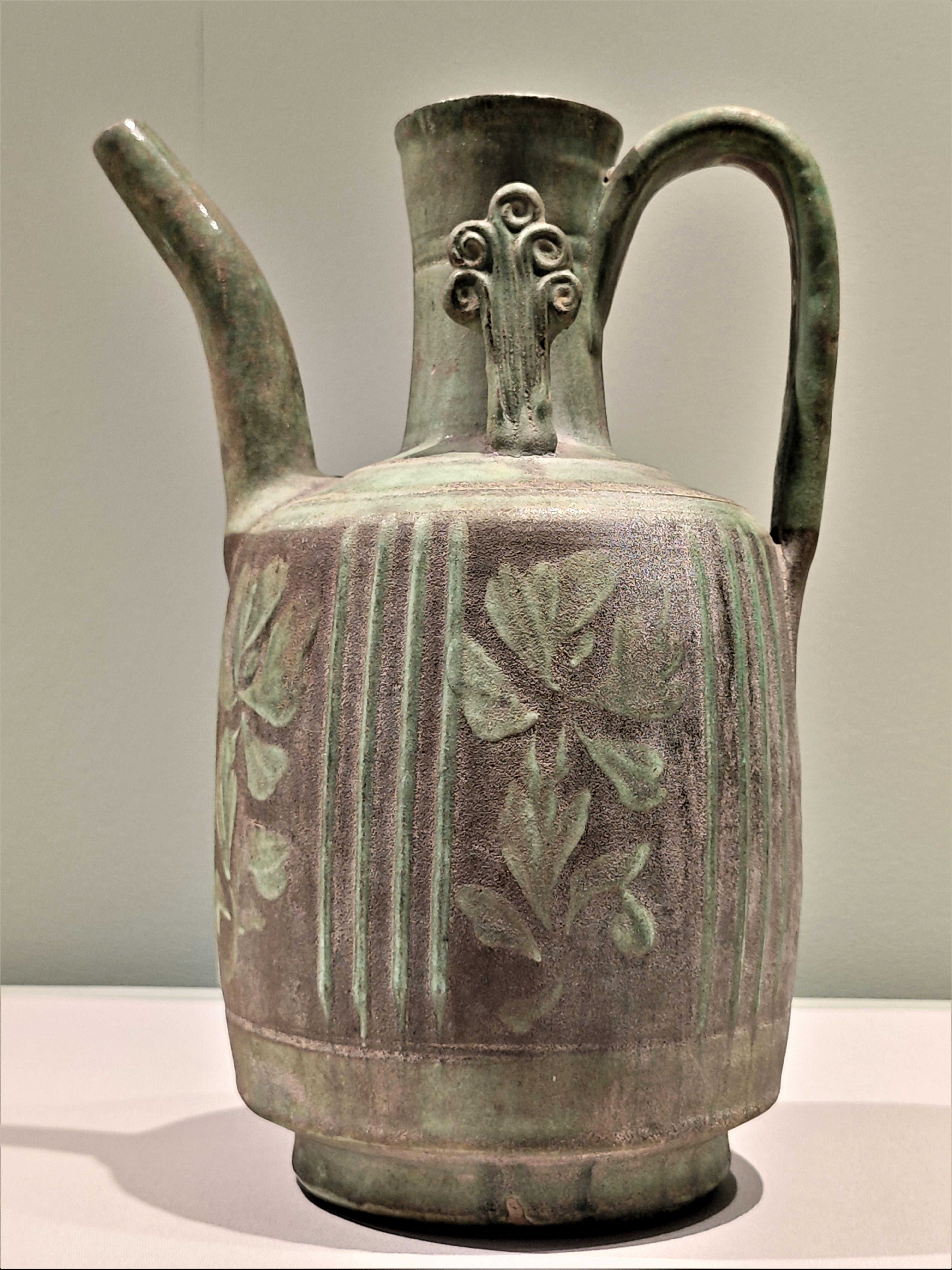 绿釉剔刻花纹执壶