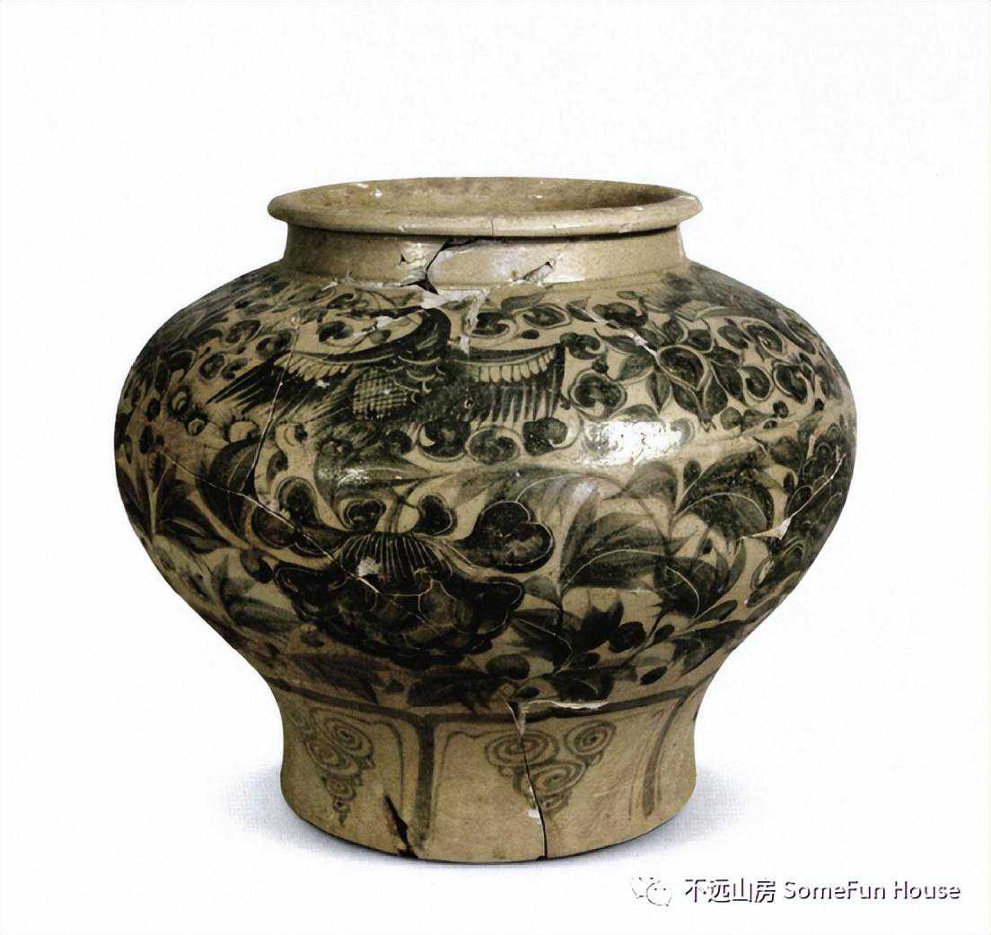 在这幅南宋画家李嵩绘的名作《骷髅幻戏图》中,傀儡艺人的担子上就有一件点茶用的曲柄茶瓶。图中的悬丝傀儡戏是宋代木偶戏的一种。只见一个附着文人衣冠的大骷髅坐于画面左边,左手骨按于左大腿骨接近膝盖处,右手提线控制着小骷髅。小骷髅对面一小儿昂首伸出右臂,正欲伸手触碰。南宋时期朝无明主,官员腐朽,王朝风雨飘摇,命悬一线。千百年来无数学者从中解读出当时的社会状态,茶文化自然也隐于其中。