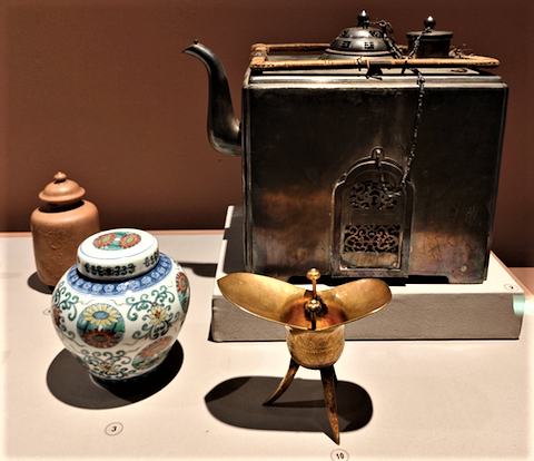 宜兴窑紫砂凸花纹诗文盖罐(左上)、银提梁方火壶(右上)、雍正款斗彩团菊纹盖罐(左下)、金爵(右下)