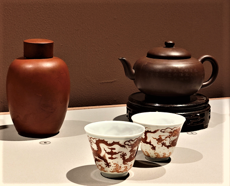 紫砂茶叶罐(左一)、宜兴窑紫砂诗句松树烹茶图壶(右上)、矾红龙纹酒杯(一对)