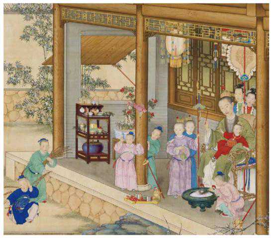 弘历对岁朝(元旦),尤为重视,每到这一天,他要与家人团聚在一起,在宫苑内点竹放炮,祈求平安吉祥。同时他还要认真地书写《心经》一册,以示庆贺。图绘乾隆皇帝与皇族子弟在庭院内点炮竹,庆贺岁朝的热闹场景。而在图的左侧摆着一个三层架子,每层拜访的都是与茶相关的器具,也体现了弘历对饮茶的喜爱。