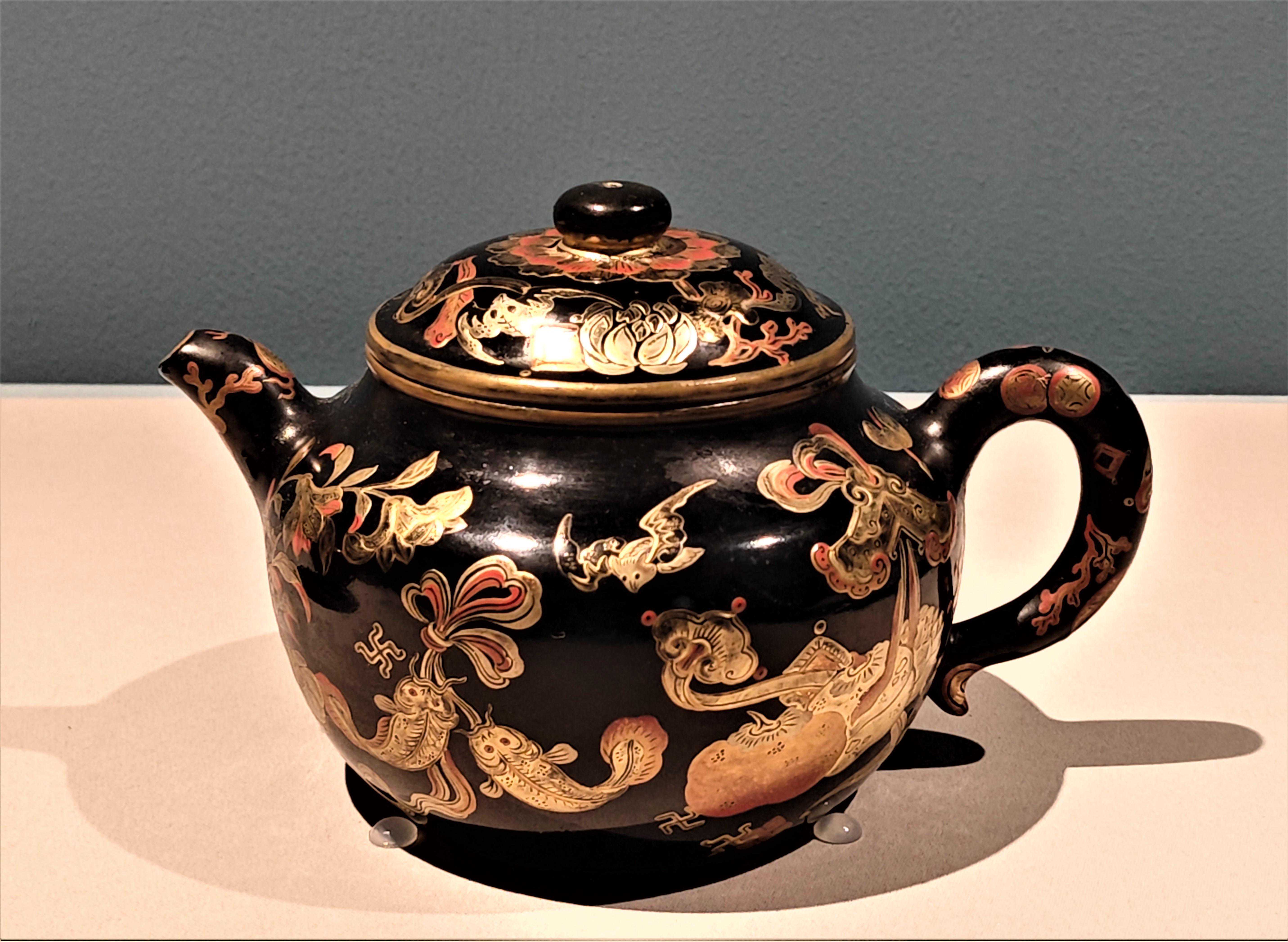 紫砂胎黑漆描金吉庆有余纹壶