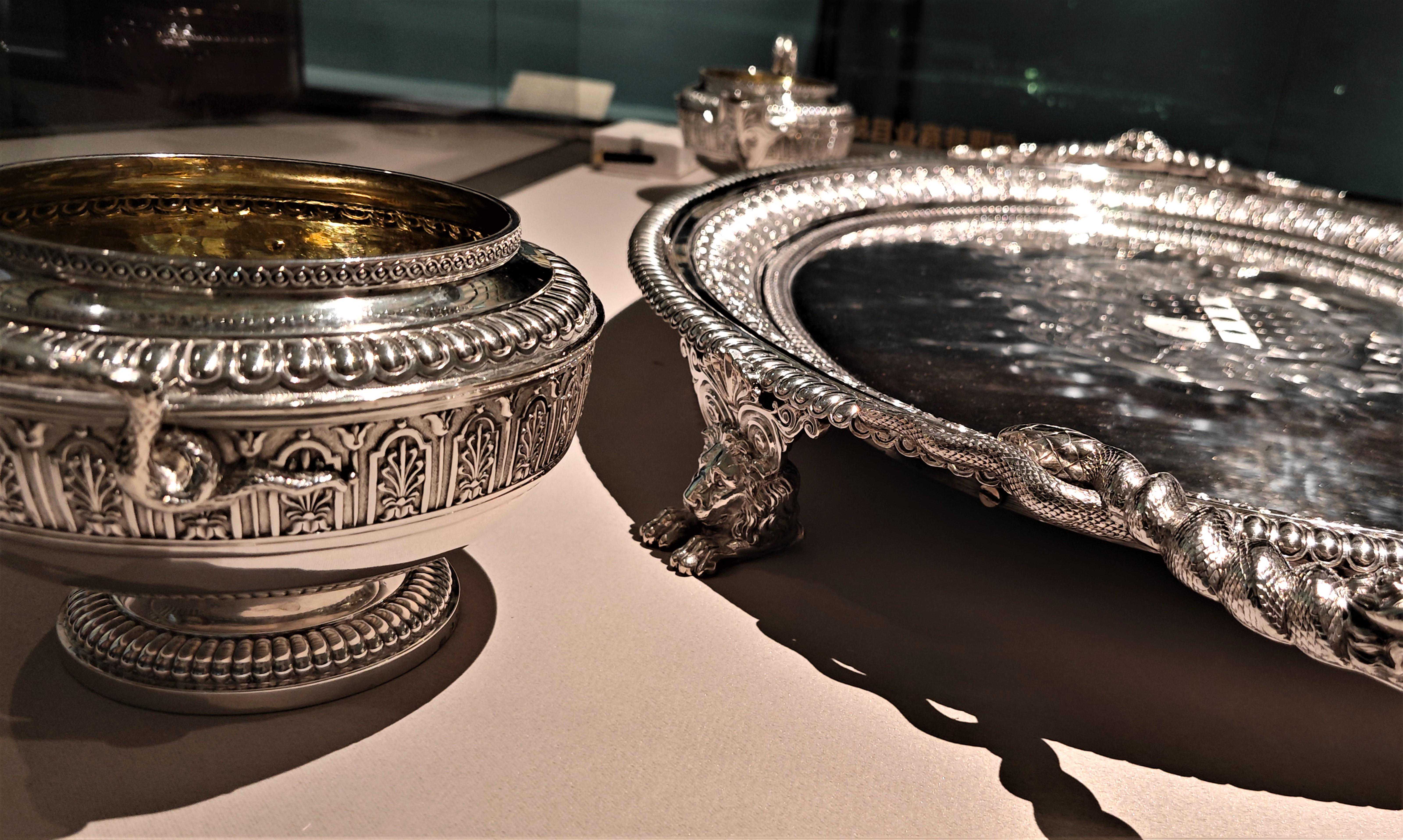 展览中还有来自英国、日本、俄罗斯的茶器精品,还有清代宫廷中使用和收藏的来自异域的茶器,以及由清宫造办处制作的外国风格的茶器。比如:故宫博物院收藏的日本银鸢尾花纹茶具套装、法国蓝釉描金寿字纹茶具、俄罗斯银刻花双耳六足盘,以及维多利亚与艾伯特博物馆收藏的“中国风”茶具、英国沃克斯豪尔瓷厂烧造的软瓷印花青花庭院图茶叶罐、德国麦森瓷厂烧造的红陶模印花卉纹壶、珐琅彩描金人物图杯及杯托等。