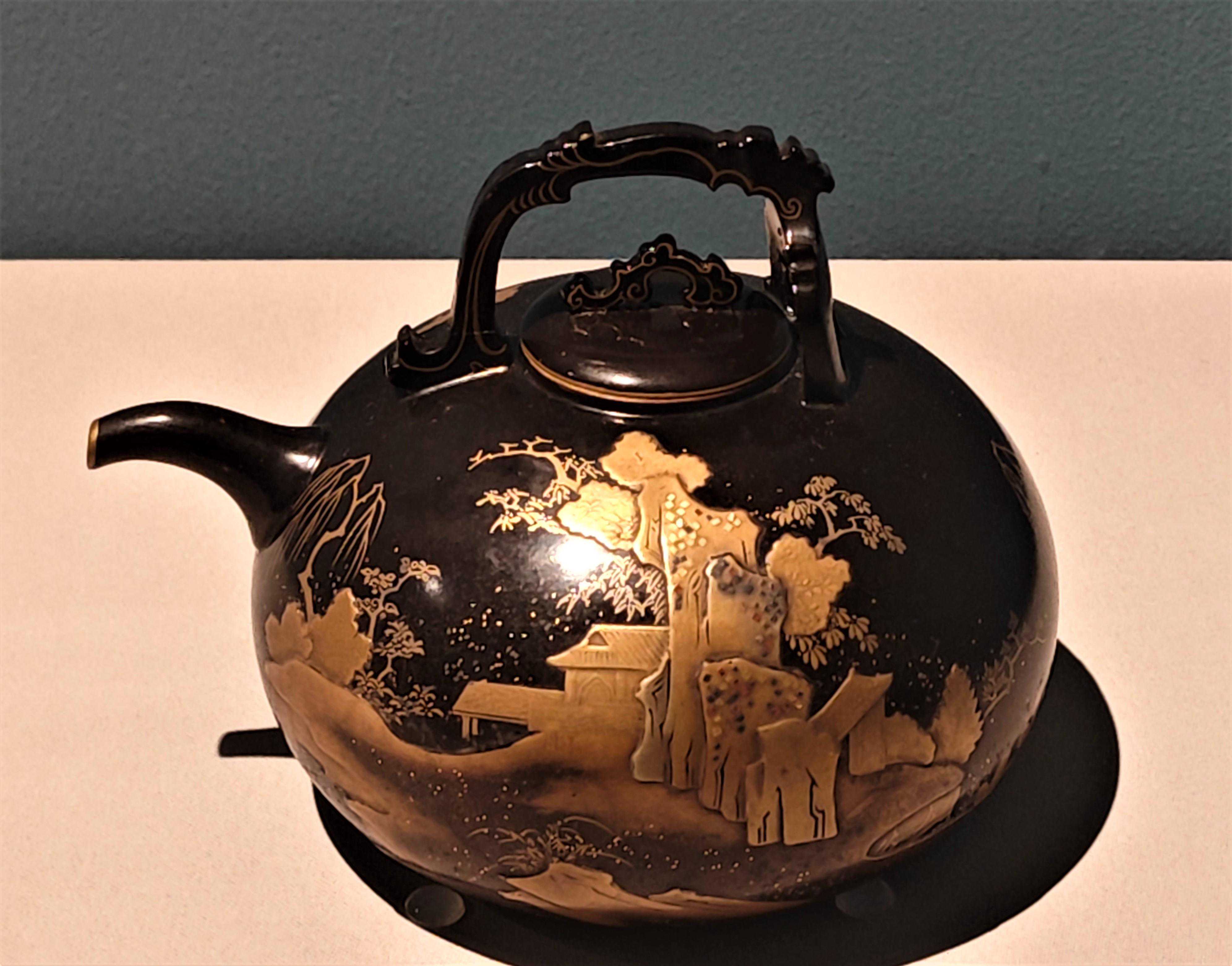 黑漆描金山水图提梁壶