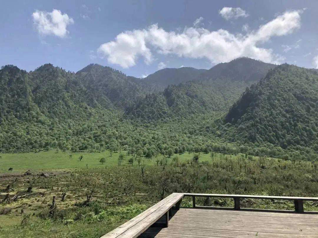 绿草茵茵的高山湿地延绵起伏,弯弯曲曲的栈道跨过平静的水面向草地深处蜿蜒而去,远处苍翠的山林轮廓在薄雾中若隐若现……