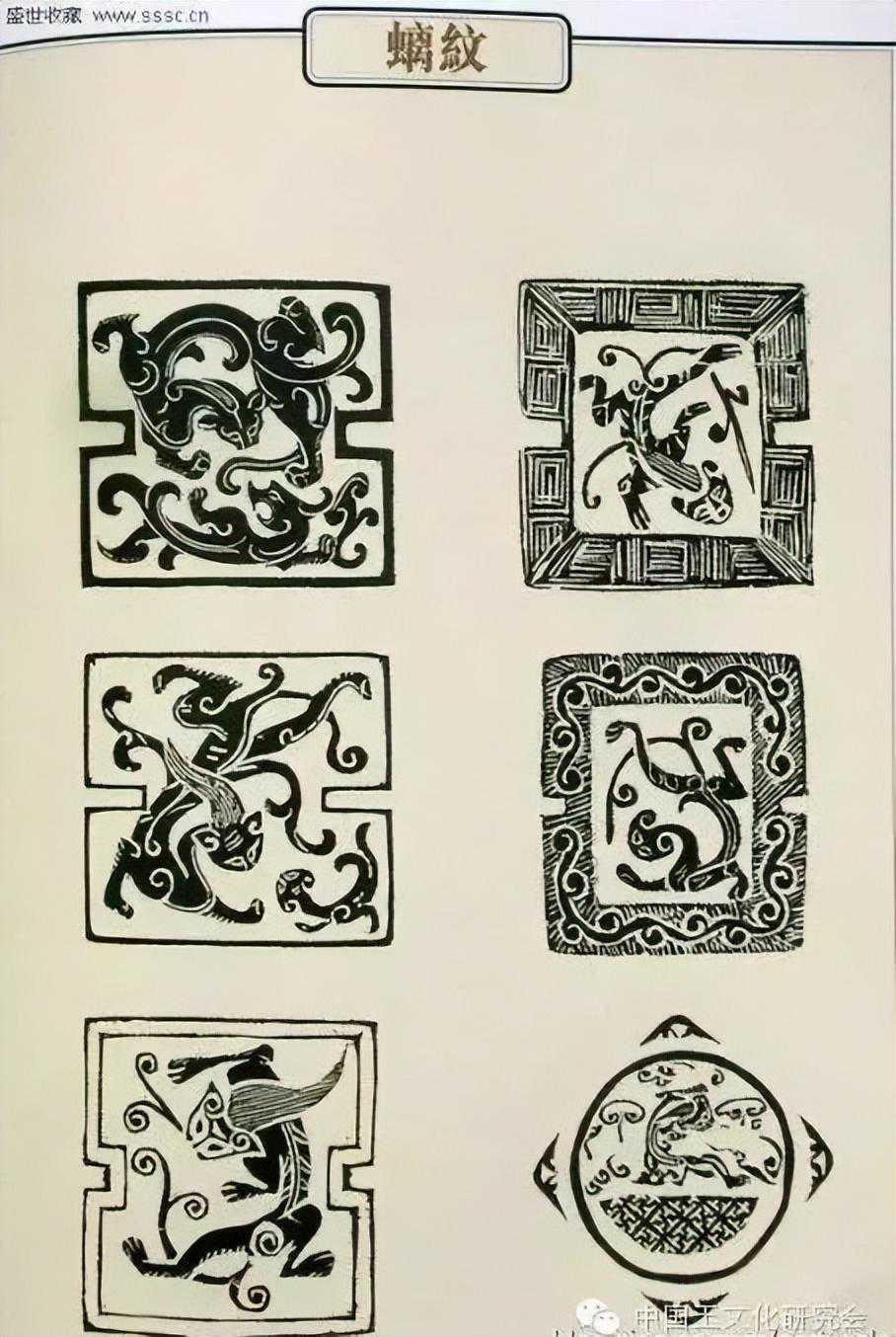 螭纹最早出现在陶器和青铜器的装饰图案中,在古玉器中,它的出现较龙要晚一些。商代晚期才开始用于玉器的装饰,汉代是鼎盛时期。最初它的形象与蛇近似,战国晚期才渐渐地与龙区分开来,成为一种独立的装饰文。
