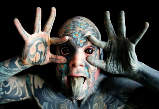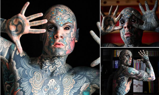 据报道,这名来自法国的小学老师名叫SylvainHelaine,现年35岁。据他自己介绍,他从27岁时开始纹身,当时他在伦敦的一所私立学校任教,那时他遇到了“生存危机”。从那时起,他就狂热地爱上了纹身。在8年的时间里,他将自己全身每一寸肌肤都弄上了纹身,包括眼睛和舌头等。迄今为止,他在纹身上的花费超过了4.5万美元,总计耗时460小时。
