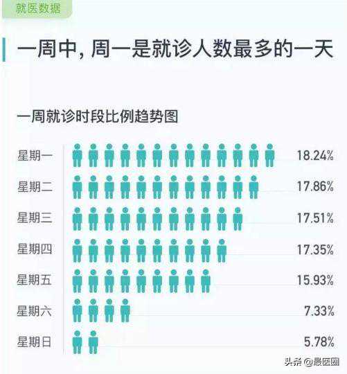 由北京市医院管理局、北京银行联合发布的“京医通大数据”显示:周一及8-9点是就诊高峰期。一周七天的就诊比例随着周一到周日越来越少。早上8-9点为取号就诊的高峰时段。而上午10-12点,下午4-6点就诊人数较少。