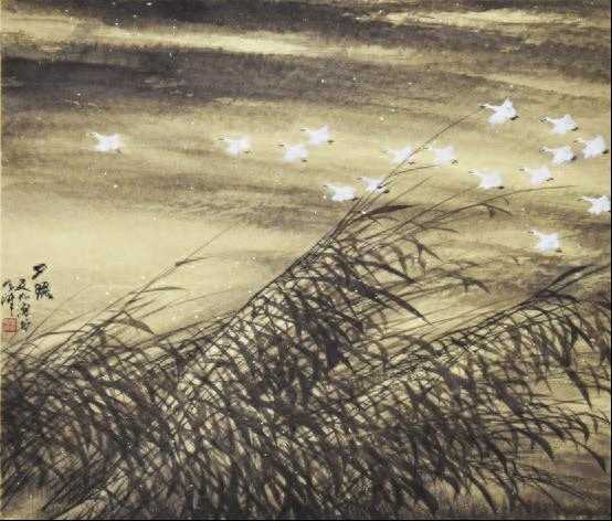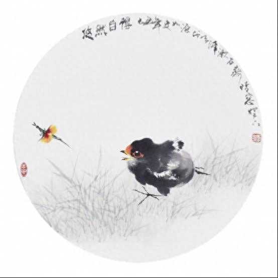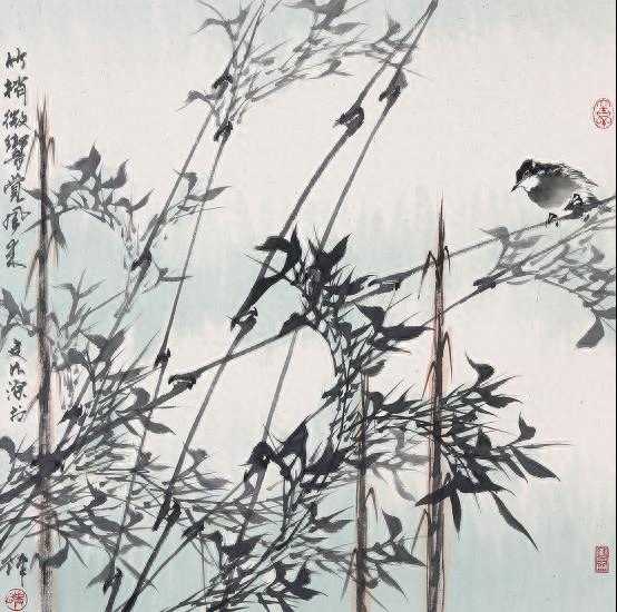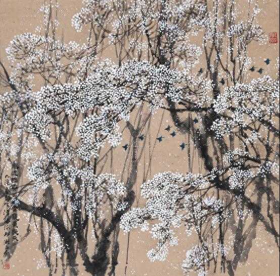为了突出带有飘逸感的花朵,他删繁就简,有意将长而繁多的叶子加工为疏密有致的短小状;画面洋溢着令人赏心悦目的质朴。
