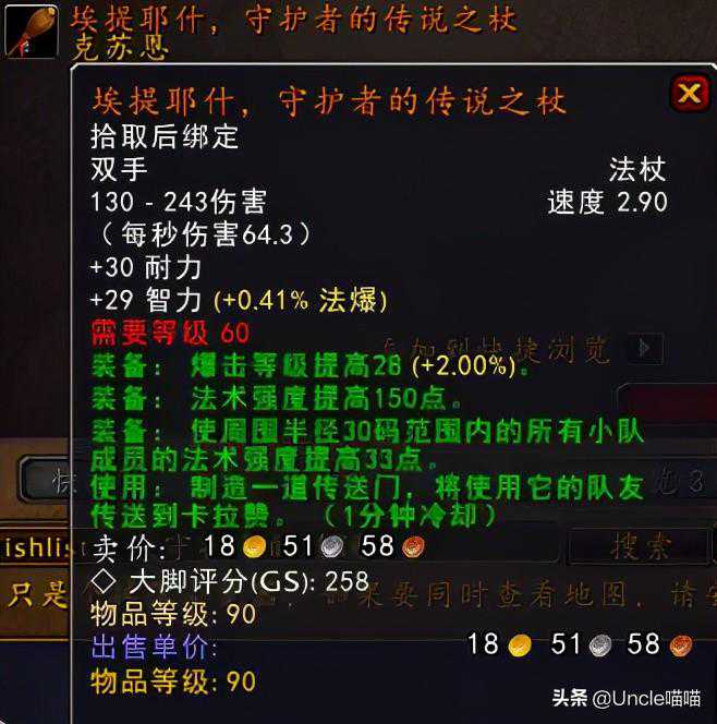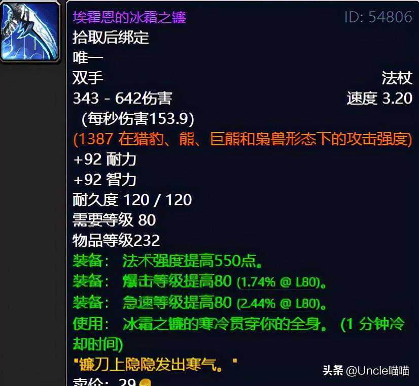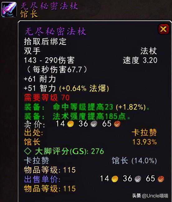 ⑰永生长夜法杖:卡拉赞夜之魇出品。这把发型的掉率看似15.79%,其实喵叔表示在我的印象中真的没有见过几次,而且造型方面的话也是很有夜之魇的遗留气息,带着弱弱的黑色气息,总体上还是不错的一把东西,推荐指数9颗星。