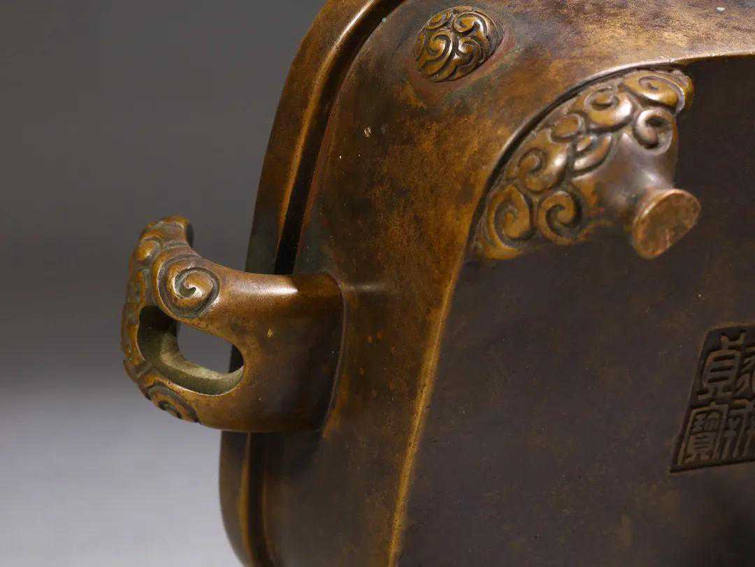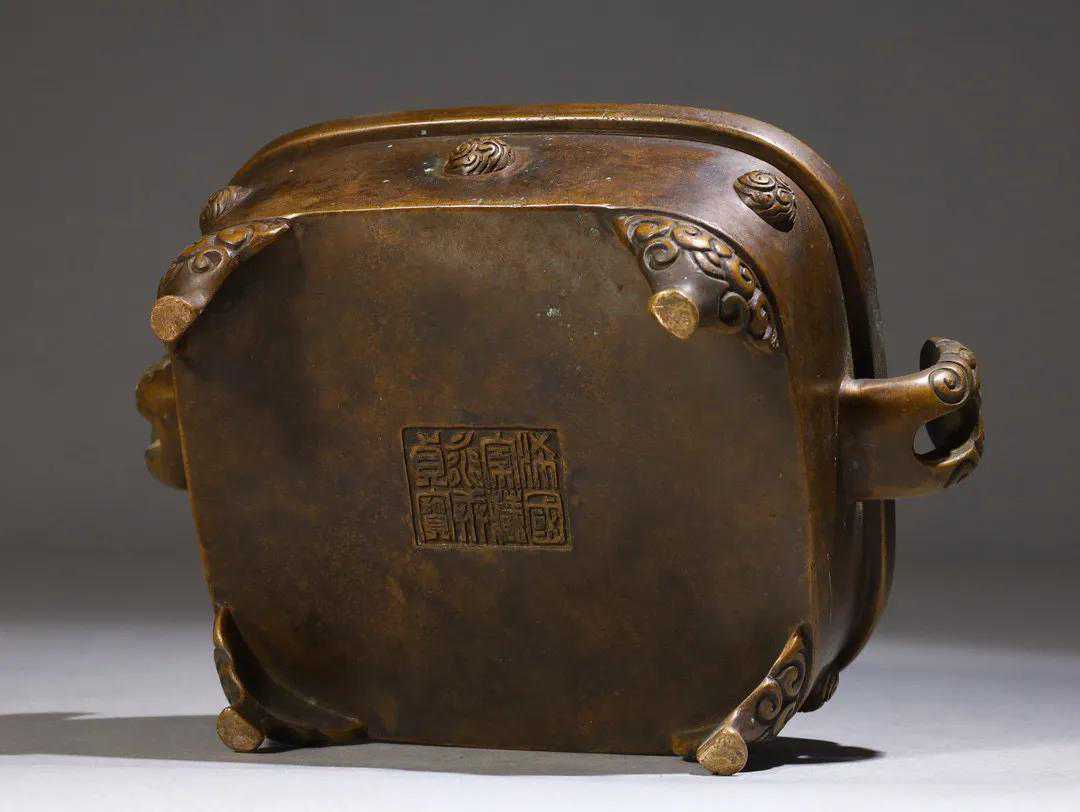 此炉造型敦实古拙,器四方唇口外侈,短直腹,浮雕谷纹鼓钉饰,颇具古意。双侧竖朝冠耳,曲转向上,耳部中央开长方孔,孔外铸刻谷纹。四足壮伟,其足之上亦铸刻谷纹为饰。炉型大小适中,势如泰山,巍然似鼎,呈天圆地方之势,炉气旺极,收放得体,和谐完美。包浆凝润有泽,皮色调浓郁雅正,内膛烧结,光自内而出,近抚则绵腻凝脂,舒心悦目。整器铜质精良,细腻滑亮,细密如水,厚重回荡,沉实似坠金。款识“浠国家藏永轩贞宝”