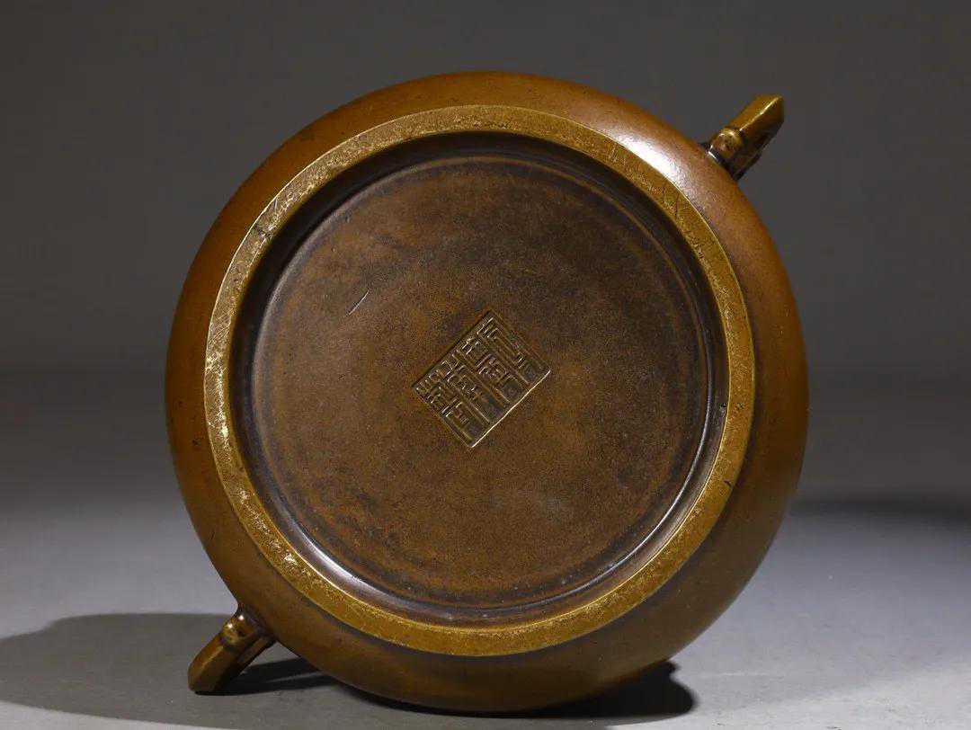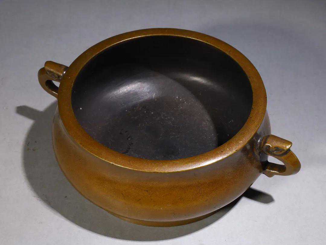 此炉为精铜铸造,敞口,束颈,弧腹,底呈圈足,饰对称双耳,器身光素,此炉手感沉重,光泽温润,整体造型简练,线条玲珑有致,堪称佳作。款识“宣德年制”