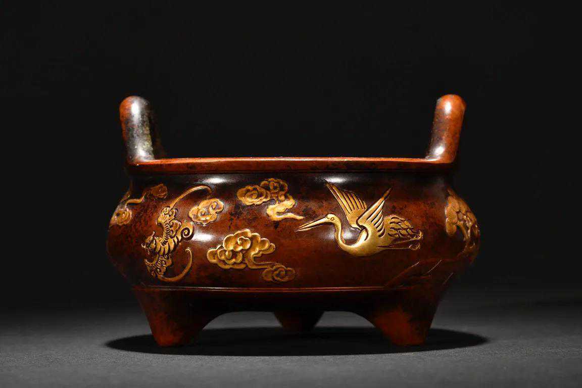 精铜铸造,局部鎏金,錾刻技法高超,精凿松树仙鹤纹,画面丰富,题材好,双耳冲天,鼓腹,三足,带款。