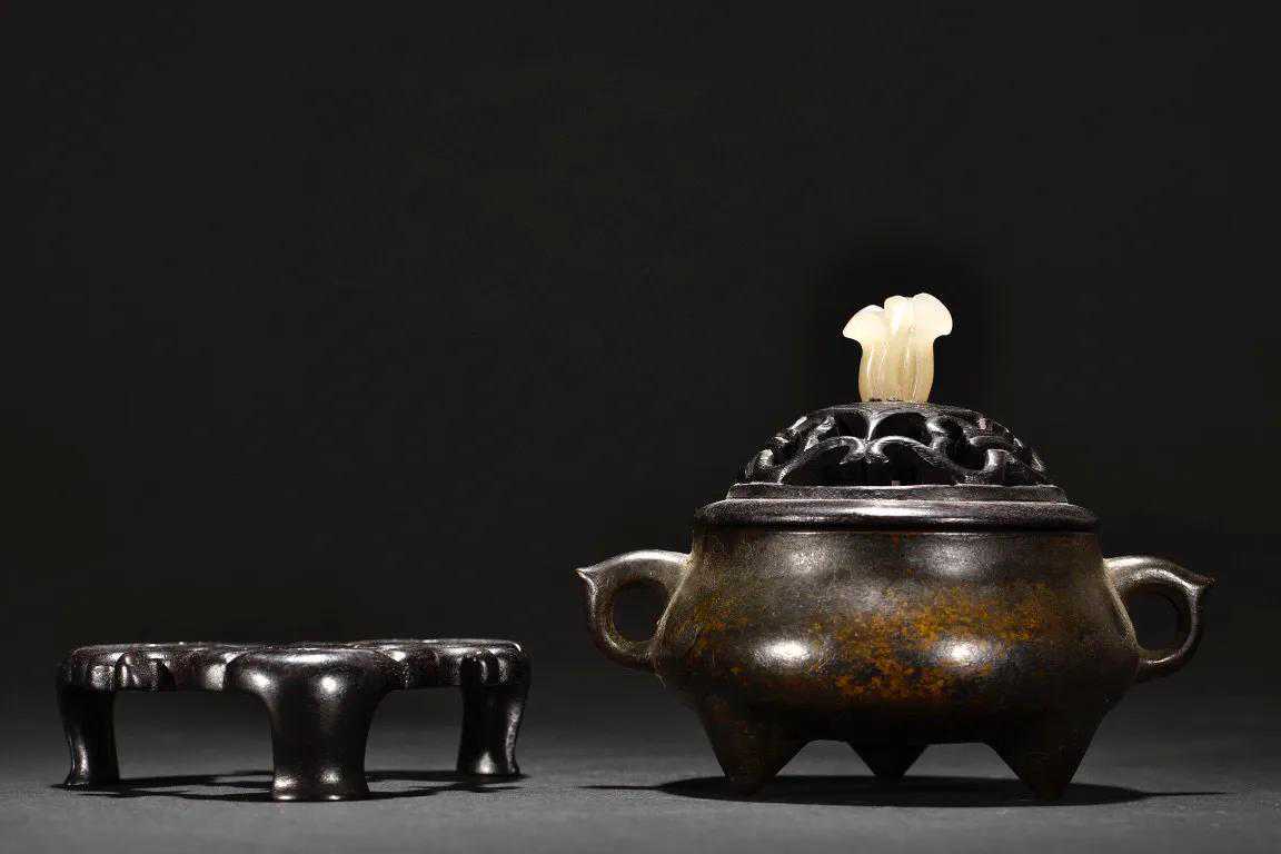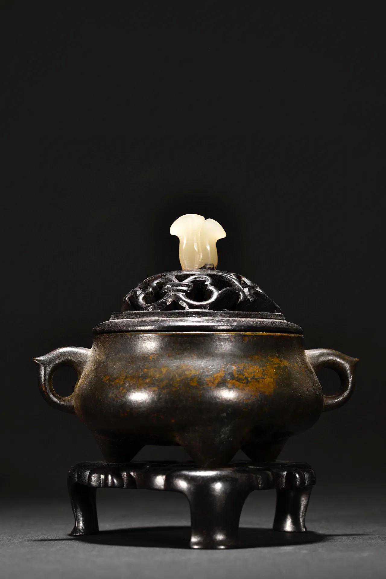 古香古色,精铜铸造,顶盖取名贵紫檀为材,镂空雕刻,镶嵌名贵和田玉刻兰花形为钮,鼓腹,三足,带款,年代久远,氧化自然,保存较好。