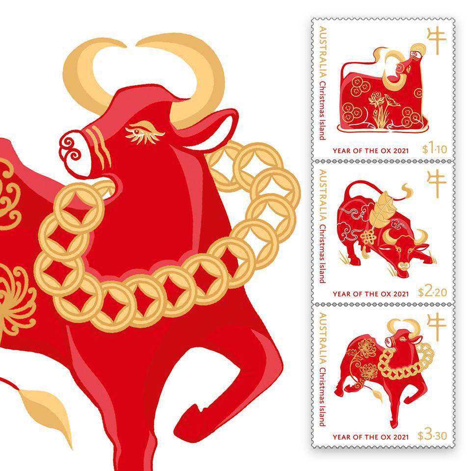 澳大利亚邮政部门发行的牛年邮票由华人插画师克里斯希·刘设计,图案以金色和红色为主,除了憨态可掬的牛,还添加了金元宝、中国结、云纹等元素,寓意着吉祥如意、幸福快乐。