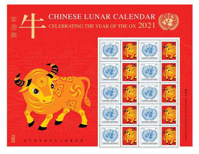 当地时间22日,联合国邮政管理局在纽约发行中国农历牛年特别版邮票版张,以庆祝2021年农历新年。