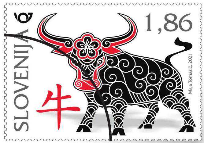 日前,斯洛文尼亚邮政部门公布了2021年“牛年”生肖邮票的图稿,邮票主图为一头牛和中文“牛”字,线条流畅,设计简洁大方。