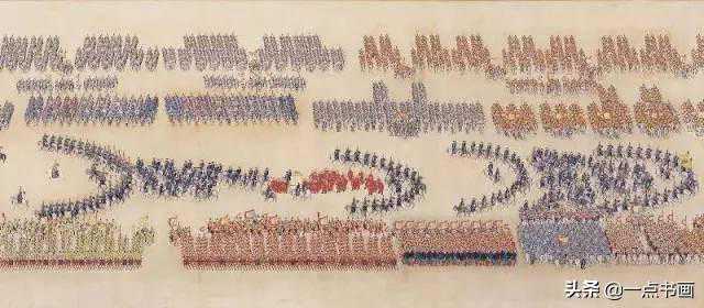 简介:《乾隆大阅图》是清代宫廷画家郎世宁晚期作品。第四卷《行阵》是一卷长24米、宽69厘米的巨幅绢本设色手卷,图中所绘人物多达9000个,虽不及半截指长,却面貌分明、神情宛然,所绘衣饰、车马枪炮、仪仗旗鼓等十分精细。