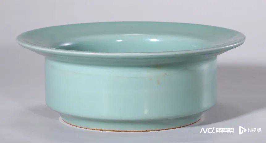 另有一只明龙泉青釉折沿洗,为仇焱之旧藏,经上海文物图书管理小组退还。此器有着浓重的官窑风格,同样官窑也有相类器型,这也反衬官窑青瓷与龙泉大窑在设计上两者有密切关系。这种折沿洗,数量与其他形式的龙泉作品相比要罕见的多。拍品一类大洗传世品当时基本是入贡大内,除了皇家收藏,存世并不多,十分珍稀。遍览世界各大博物馆馆藏,相类者屈指可数。