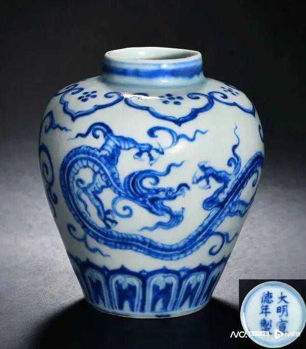 明宣德御制青花白地如意披肩龙纹宝罐款识:“大明宣德年制”楷书款H:13.8cm